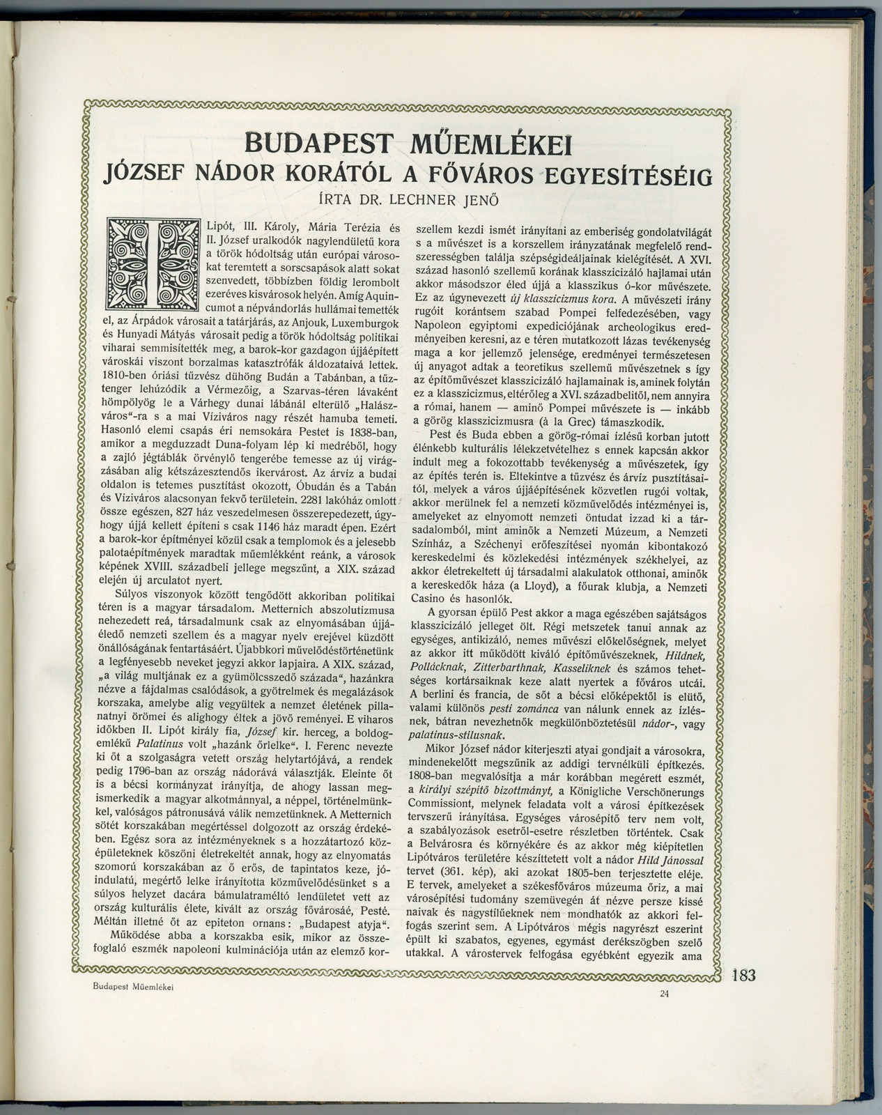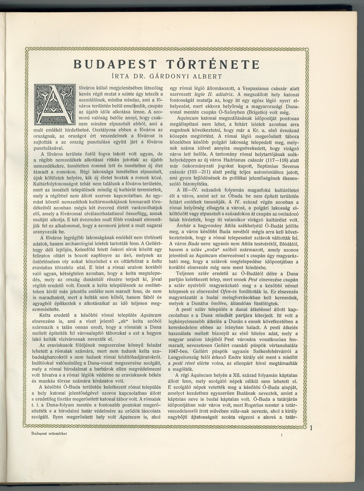 A Lechner Jenő szerkesztésében megjelent kötet nyolc kiváló tudósnak (Gárdonyi Albert, Kuzsinszky Bálint, Szőnyi Ottó, Lux Kálmán, Csányi Károly, Foerk Ernő, Kertész K. Róbert, Lechner Jenő) a jubileumi ünnepség kapcsán tartott előadásait tartalmazza. A mű összefüggő képet kívánt nyújtani az egyesített három város fejlődéséről és műemlékei történetéről a kezdetektől a főváros egyesítéséig. A nyitó tanulmányban egy átfogó Budapest történetet ismerhetünk meg Gárdonyi Albert tollából, majd a kronológiai idővonalat megtartva megismerhetjük a legrégebbi, aquincumi műemlékeket, a románkori, a gótikus, a reneszánsz „stíluskorszak” műemlékeit, a török hódoltság időszakát, a barokk kor emlékeit. Az utolsó írás a József nádor korától az egyesítésig terjedő időszakot öleli fel. A kötet készítői nagy hangsúlyt fektettek arra, hogy a külföldi olvasók és kutatók számára is hozzáférhetővé tegyék ezt az anyagot, ezért francia, angol, olasz és német nyelvű kivonatokat is készítettek a magyar szöveghez. A tanulmánykötet a maga korában úttörőnek számított nemcsak a műemlékek illusztrált bemutatása, a múltat a folyton fejlődő jelennel való összekapcsolásának gondolata miatt, hanem előadásmódjával is, amely a hazai műemlékek iránti érdeklődés szélesebb körökben való terjesztését tűzte ki célul. Hiszen a műemlékeinknek semmi más nem jelenthet akkora védelmet, mint a megtartást célját ismerő, a műemlékekért lelkesülő közvélemény. A helyesen kialakított műemléki közhangulat pedig maga a legjobb védelem.