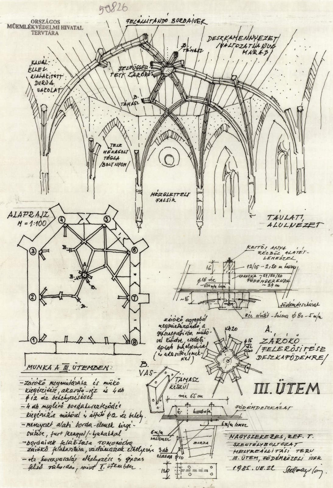 Helyreállítása az 1986-ban elhunyt Erdei Ferenc egyik utolsó munkájaként valósult meg 1981–1986 között; Erdei munkatársai Szekér György és Sedlmayr János voltak. A helyreállítás során készült el a tető és a támpillérek zsindelyfedése, kiegészítették a gótikus nyíláskereteket, a festett berendezést restaurálták. Emellett a helyszíni kutatások során előkerült kőtöredékek alapján a teljes boltozatot hitelesen rekonstruálhatták volna, azonban a festett famennyezetet szintén értéknek tekintve, más döntés született. Mindössze utalásszerűen rekonstruálták a szentély első szakaszának gótikus hálóboltozati íveit (boltmezők nélküli bordaívek, csomópontok és egy zárókő felállításával) úgy, hogy közben a famennyezetet is megtartották. A részleges rekonstrukcióhoz a déli előcsarnokból emelték ki az oda másodlagosan befalazott bordaköveket, és a szentélyben lévő lenyomatok alapján tudták az egykori boltozatot elvben rekonstruálni. A részleges felállítás, ami a bordarendszer mintegy 40%-ának eredeti helyre történő visszahelyezését (anastylosisát) jelentette, egyértelműen utal a kétszakaszos, sorolt csillagháló-boltozatos térlefedésre, még ha a boltmezők üresek is maradtak. A szentélyboltozat helyreállításának kivitelezését három ütemben határozták meg, és mindháromhoz szöveggel kísért magyarázó ábrák készültek 1:20 és 1:100 léptékben, 1985 augusztusában. A műemléki tervtár leltározott állományában lévő terveket tovább fogja gazdagítani a jelenleg feldolgozás alatt álló hagyaték, amelyet Szekér György halála után örökösei bocsátottak rendelkezésünkre 2026 telén.