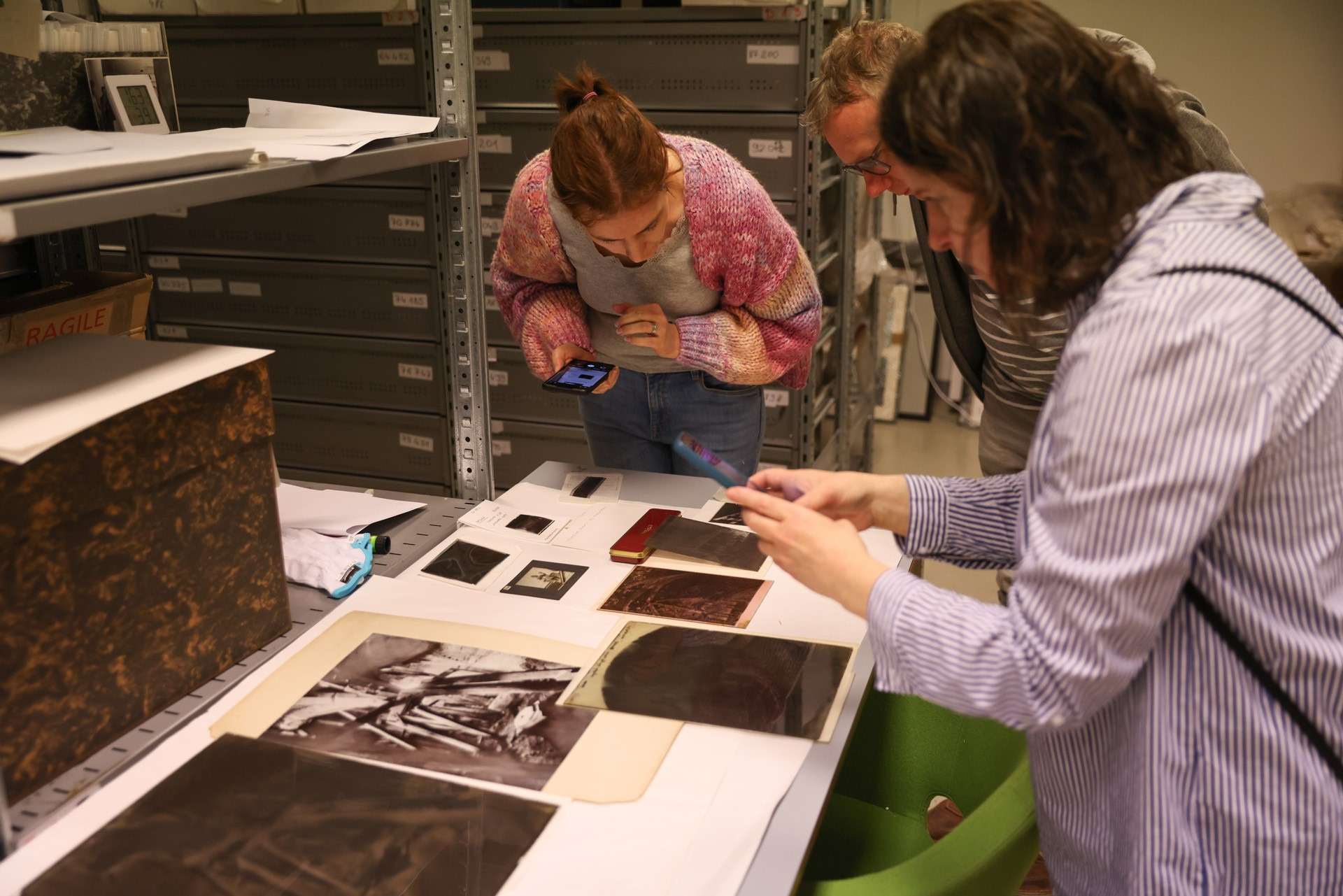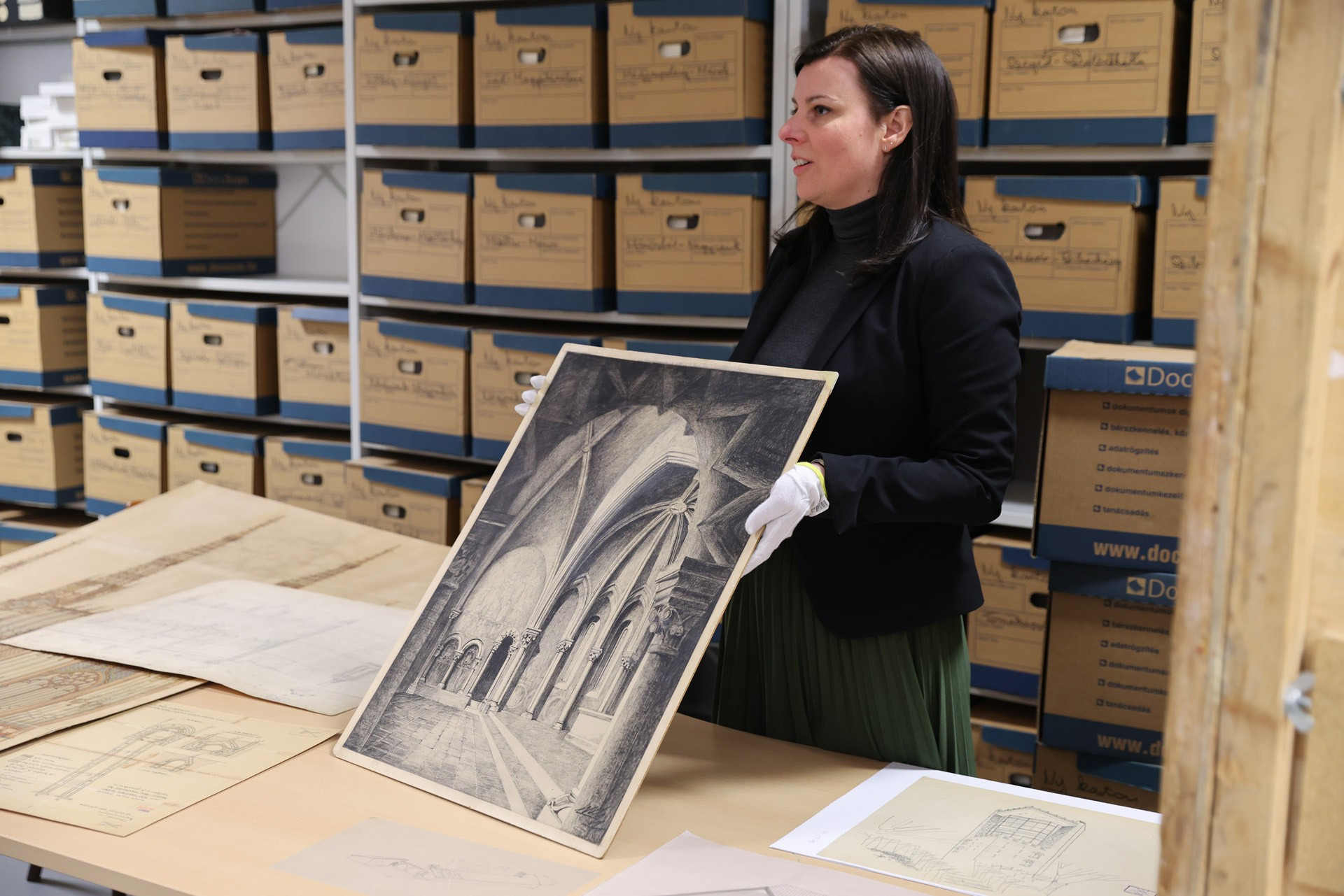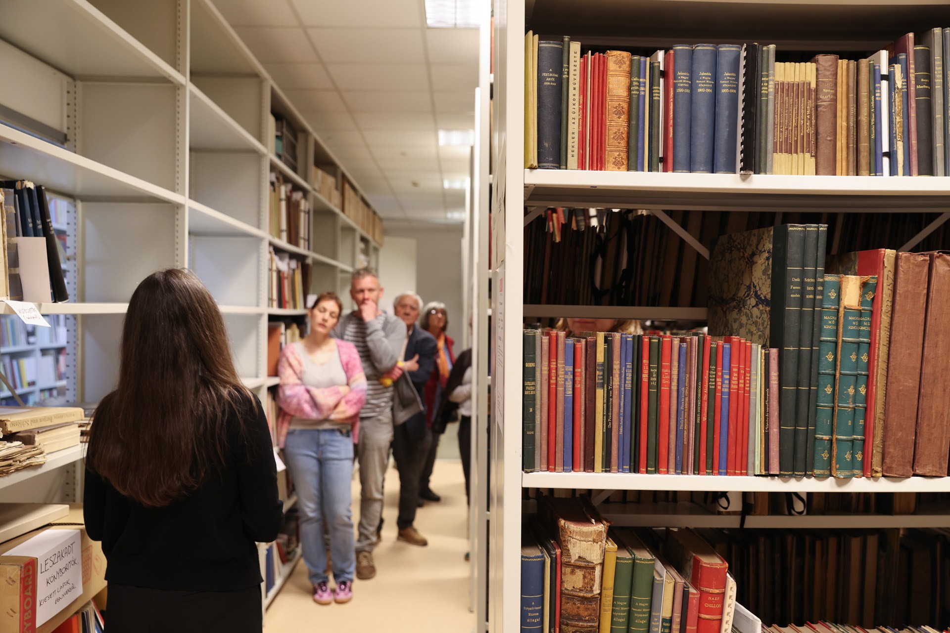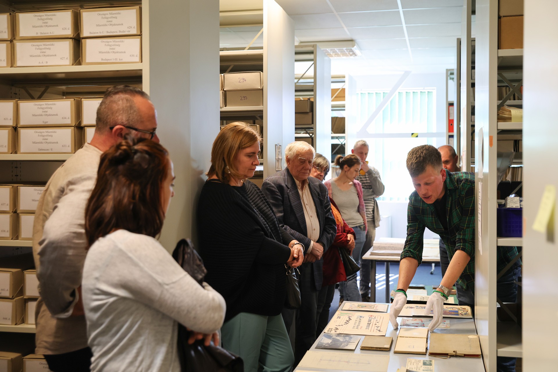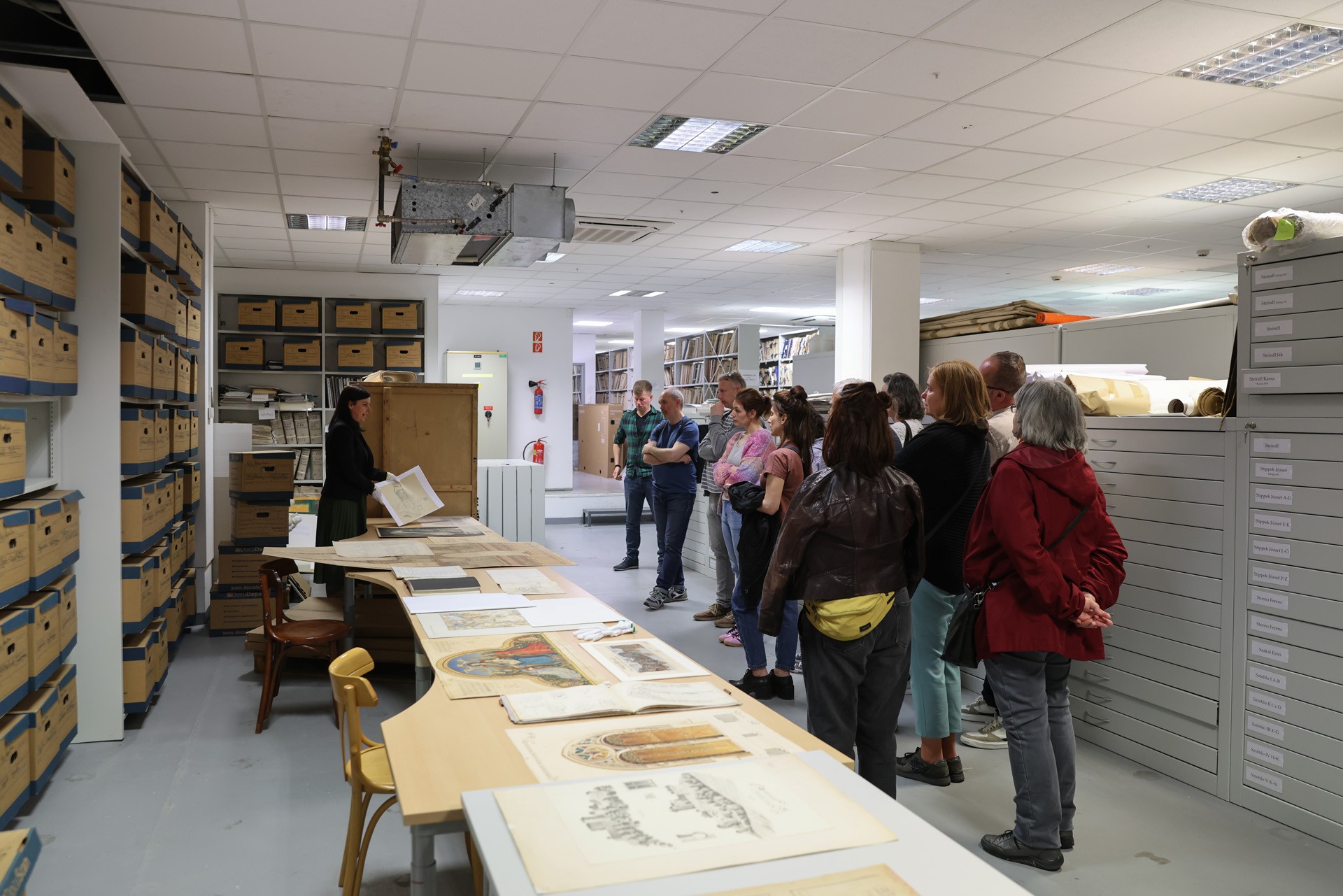 Mind a délelőtti, mind a délutáni csoportba szép számú érdeklődő gyűlt össze, akik a vezetés során bepillantást nyerhettek a négy gyűjtemény évszázadokat felölelő anyagaiba, valamint a hazai műemlékvédelem történetének alakulásába. A Magyarországi Műemlékek Ideiglenes Bizottságának 1872-es megalapítása előtti időkből megtekinthették Rómer Flóris helyszíni rajzait-feljegyzéseit tartalmazó vázlatfüzeteit. A tudományos irattár hivatali iratainak segítségével igyekeztünk megeleveníteni a Műemlékek Országos Bizottságának gyakorlati működését; a székelyderzsi unitárius templom középkori falképeinek 1887-es előkerüléséről, továbbá Huszka József általi dokumentálásáról szóló beadvány szöveges forrásait az irattárban, a Huszka által leadott akvarellmásolatokat pedig a tervtárban mutattuk be. Utóbbi gyűjtemény ez alkalomra összeállított válogatása egyaránt körüljárta a műemlékek dokumentálásának, illetve helyreállításának történetét Steindl Imre purista restaurálásaitól és a kassai dóm monumentális orgonatervétől kezdve, egészen Erdei Ferenc tudományos megalapozottságú helyreállításáiig. Fotótárunk bemutatásában nagy hangsúlyt kaptak a hazai műemléki fotográfia fejlődését is befolyásoló technikai változások. Az egyes korszakokban alkalmazott hordozók majd mindegyike előkerült Divald Kornél, Petrik Albert vagy Seidner Zoltán hagyatékának helyenként művészi igényű darabjai mellett. Könyvtárunk anyagából a műemlékekkel foglalkozó kiadványok, például Magyarország műemlékeinek Gerecze Péter által 1905-ben összeállított jegyzéke mellett, igazi könyvészeti ritkaságokat mutattunk be, köztük Hartmann Schedel Világkrónikájának német nyelvű kiadásával, amely 1493-ban Nürnbergben jelent meg. A raktárséták interaktív formában zajlottak. Miközben megismerhették a gyűjtemény működését és a dokumentumok kutatásának feltételeit, a látogatókkal több ízben kötetlenebb beszélgetések alakultak ki a műemlékek és a műemlékügy mindenkori kulturális-társadalmi szerepéről.