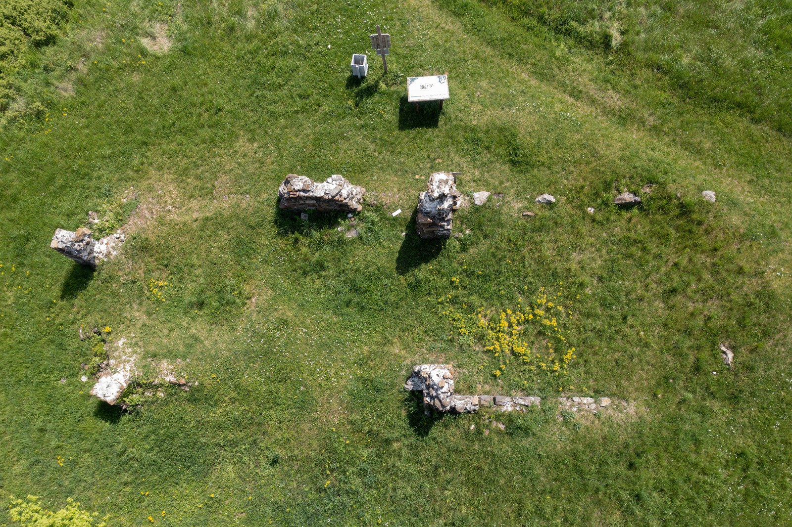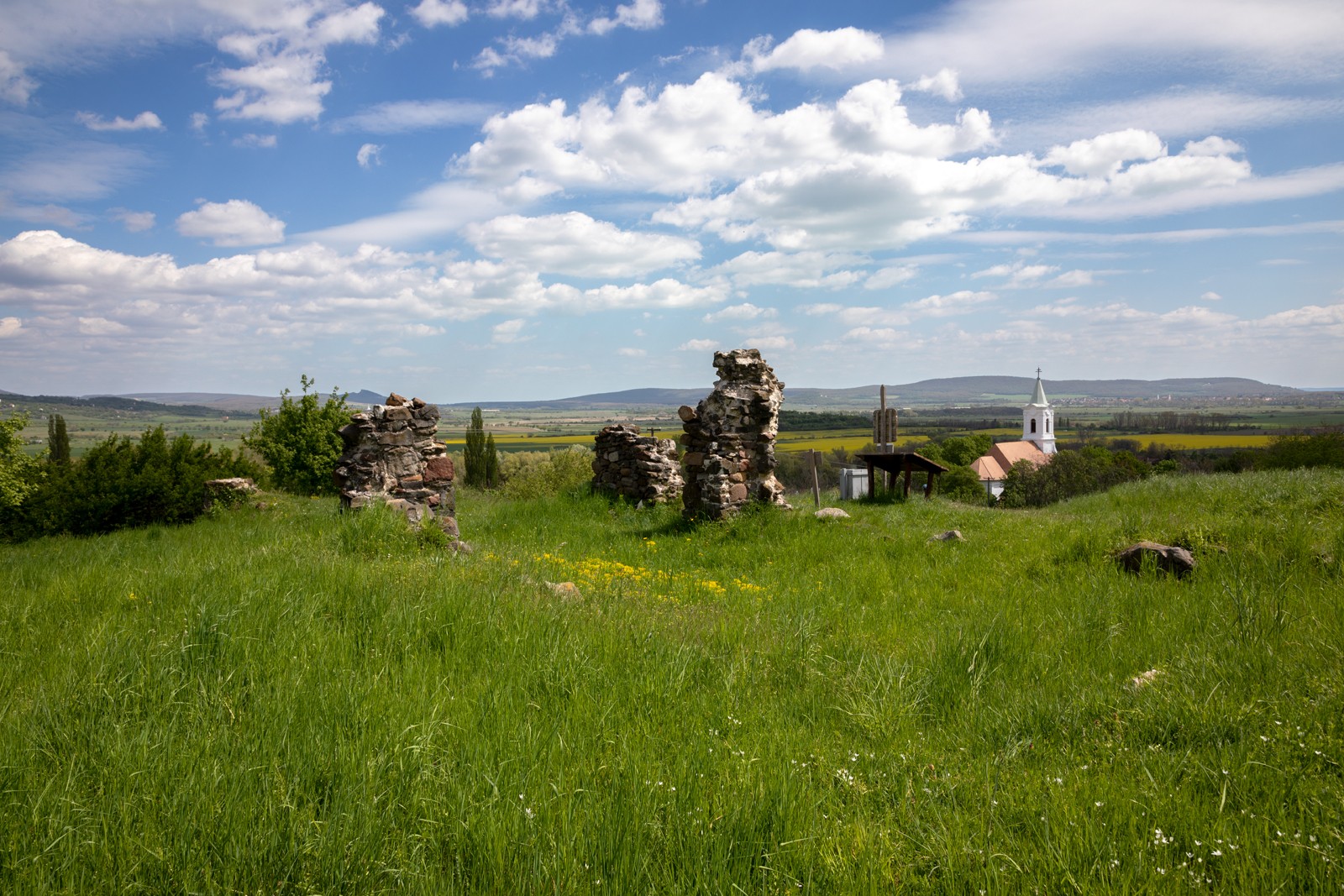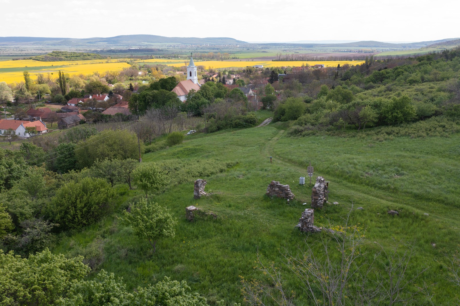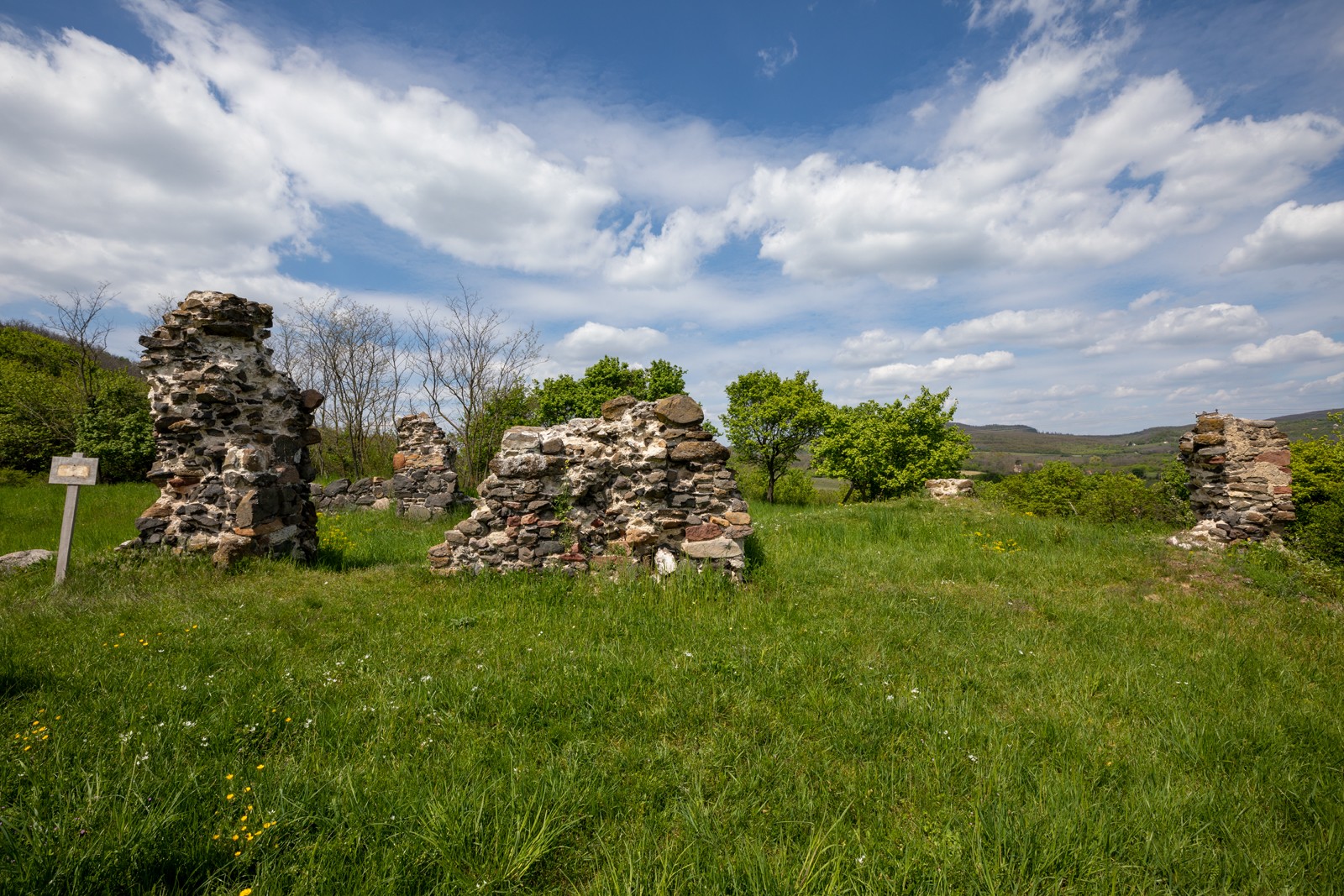 A településtől északnyugatra, a Kopasz-hegy és a Mátyás-domb keleti lejtőjén áll egy törtkőből épített, keletelt, téglány alaprajzú hajóból és a nyolcszög három oldalával záródó, nyújtott, nagyjából a hajóval egyező hosszúságú szentélyből, a gótikus szentély sarkain és hosszoldalán 2-2 támpillérrel erősített templom konzerválatlan romja. Az először 1277-ben említett település Mindenszentek tiszteletére szentelt templomnak papját az 1333-as pápai tizedjegyzékben szerepel. Koppány Tibor (1972) szerint a templomot a 15. században bővítették. 1860-ban Rómer Flóris még magasan álló falakkal írta le a középkori templomot. A hajó nyugati oldalán bejárat nyílt, a déli falat ablakok törték át, a szentély északi oldalán sekrestye állt, a szentély boltozott volt. A hajó nyugati végében három gerenda helye jelölte a karzatot. A maradvány a 20. század első felében jelentős részt elpusztult. A templom szerkezetének sajátossága, hogy a hajó és a szentély egy vonalban fut. A szentély déli falának egy szakasza 2 m, a záradék délkeleti támpillére kb. 2,5 m, az északi támpillér 1,5 m, a diadalív két pillére kb. 2,5 m, a hajó északi falának keleti fele kb. 1 m magasan áll. A szentély többi falát és támpillérét, valamint a hajót a földből kibukkanó egy-egy kő, illetve a terepvonulat rajzolja ki.