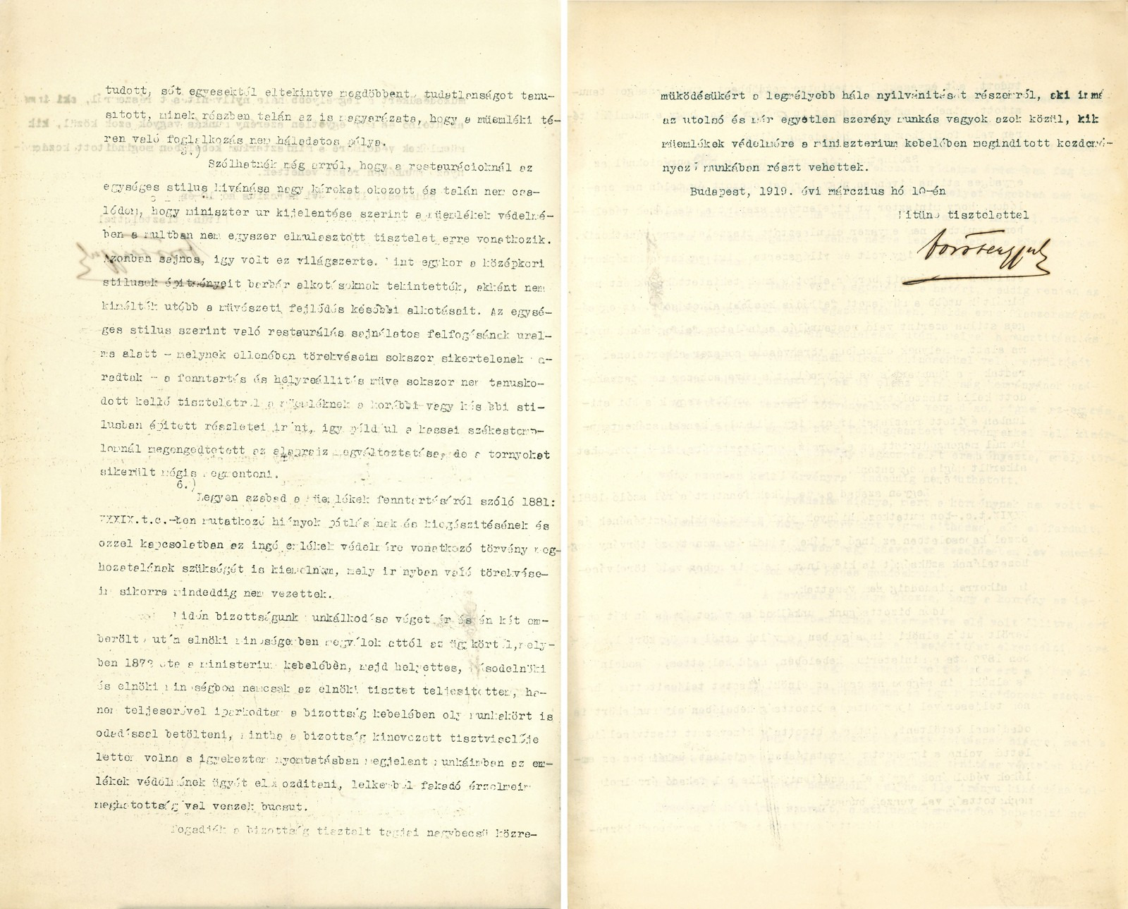 „…Ez oly esemény Bizottságunk életében, mely kétségtelenül mély benyomást gyakorol mindazok lelkületére és érzületére, kik Excellenciád bölcs elnöklése alatt rövidebb-hosszabb idő óta működhettek közre hazánk műemlékügyének előbbrevitelében és a kik ismerik mindazon ténykedéseket, melyekkel Excellenciád a M.O.B munkásságát elmélyítette, gazdaggá és értékessé tette. Excellenciád ott állott a M.O.B. bölcsője mellett, féltő gonddal ápolta a magyar kulturának ezt a zsenge hajtását, a mikor az 1881. évi XXXIX. t. c. az életre nyilott,- 1886-tól 1895-ig mint a Bizottság helyetteselnöke a kezdettel járó nehézségek leküzdésében fáradhatatlan tevékenységet fejtett ki, olyan időben, a mikor a műemlékvédelem gondolata hazánkban teljesen uj volt, olyan korban, mikor a magántulajdonnak és a magánjognak a műemlékvédelem folytán elkerülhetetlenné vált, magasabb nemzeti és kulturális érdekből való legcsekélyebb mérvű korlátozása…”