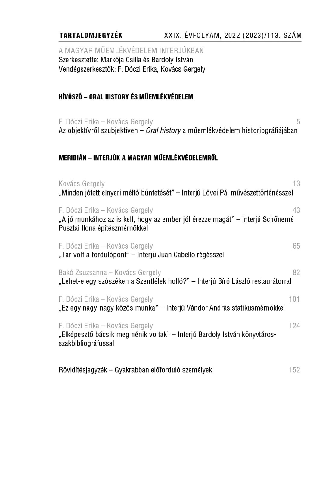 A kötetben egy rövid bevezető után hat szerkesztett, lábjegyzetelt és illusztrált mélyinterjú kapott helyet. A megszólalók különféle szakterületek jeles képviselői, akik több évtizedes műemlékes múltjuk személyes vonatkozásairól vagy általános jellegű kérdésekről is bölcsen, szórakoztatóan nyilatkoztak. Művészettörténész, régész, restaurátor, építész, statikus és gyűjteményvezető idézi fel az Országos Műemléki Felügyelőség és utódintézményei legendás vagy elfeledett alakjait, feltárva a kapcsolati hálót, a döntéseket befolyásoló körülményeket, illetve számos tanulságos történet hangzott el a nagy elhivatottsággal végzett közös munkáról.