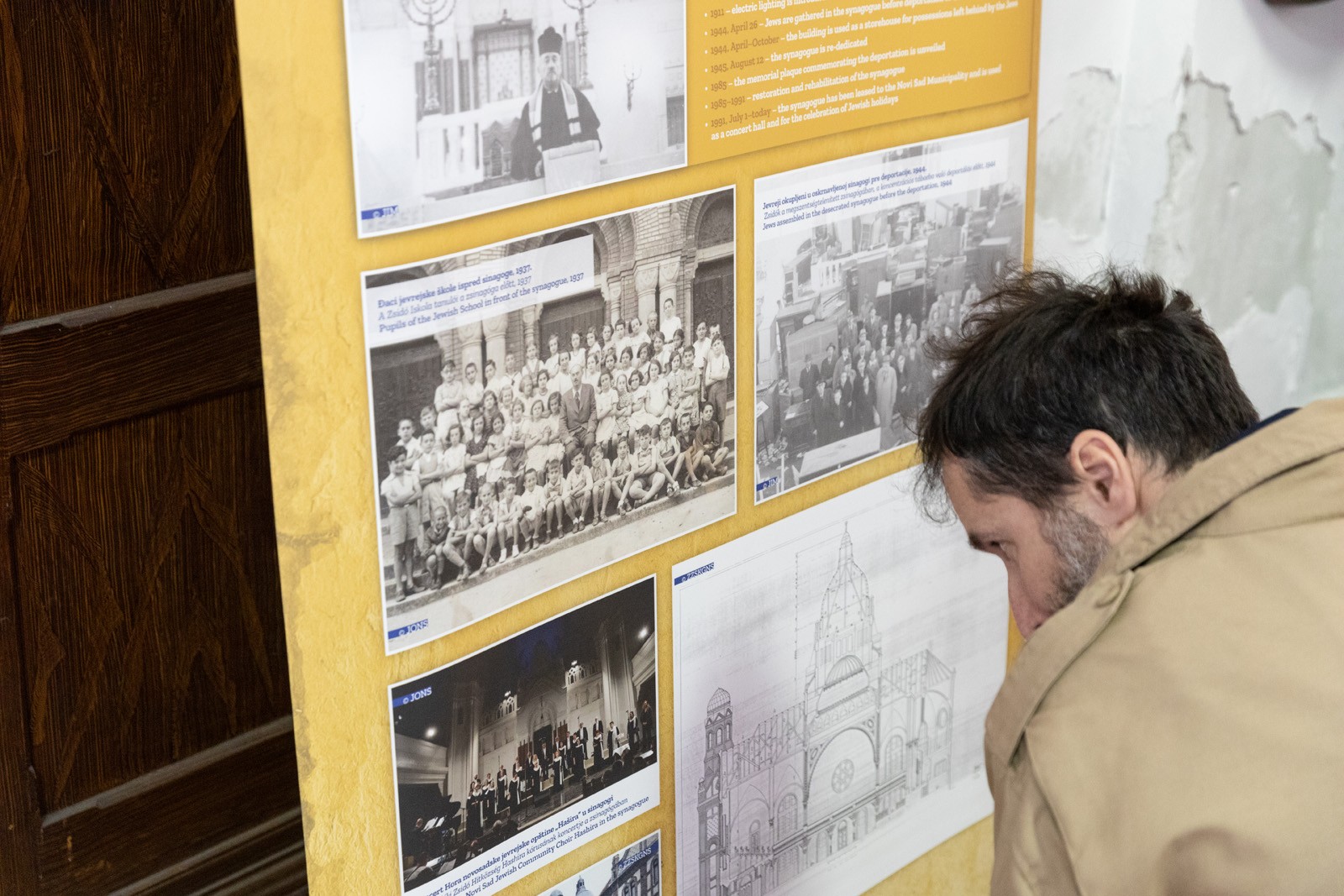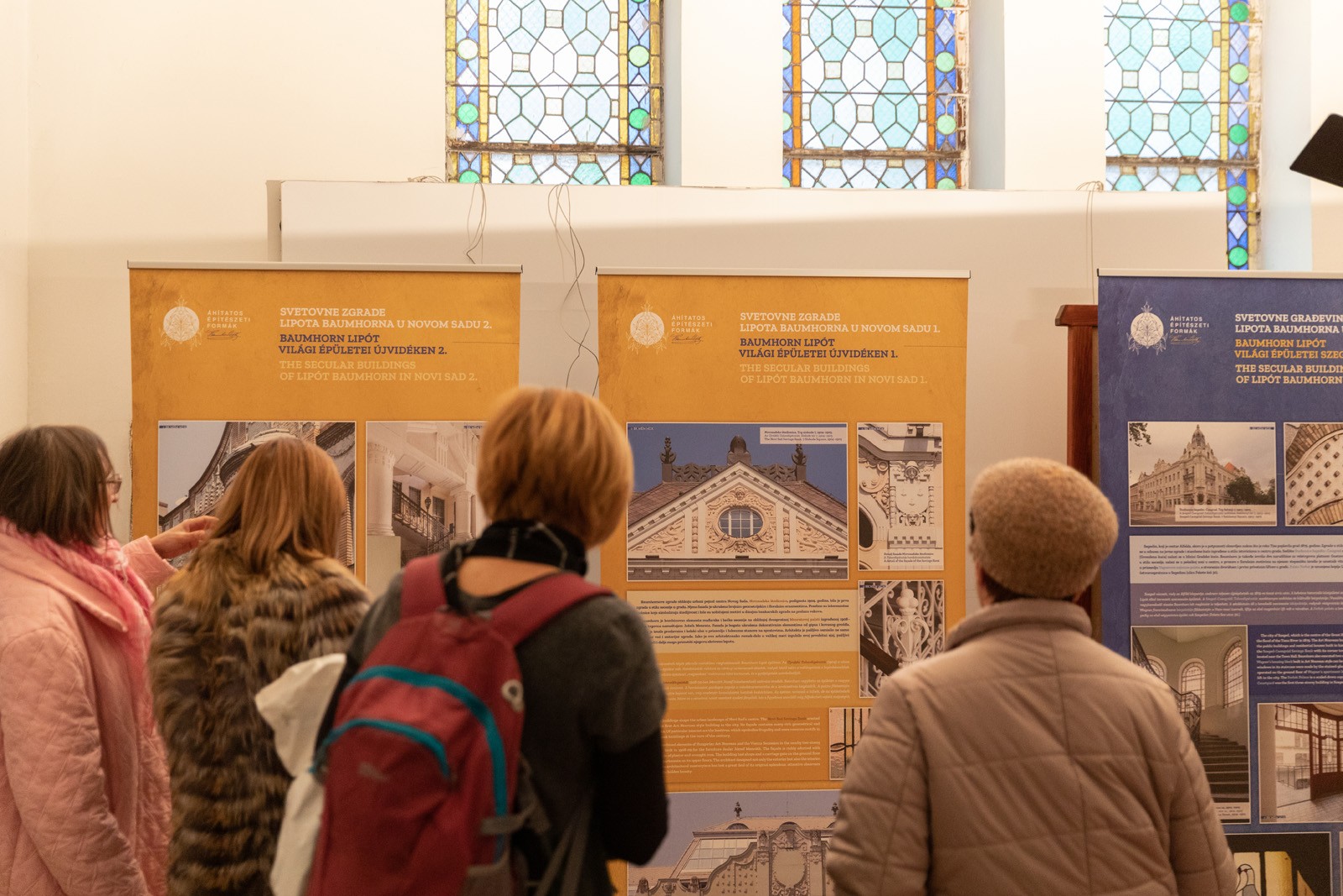 Újvidéken a zsinagóga előcsarnokát és lépcsőházait töltötték meg a kiállított roll-upok és a jubiláló Szegedi Új Zsinagóga díszes mennyezetfestését bemutató installációs elemek. A megnyitó ünnepséget a közösség Hashira-kórusa vezette be, majd Mirko Štark, az Újvidéki Zsidó Hitközség elnöke köszöntötte a megjelenteket. Az Baumhorn Lipót munkásságát és a Szegedi Új Zsinagóga építéstörténetét ismertető kiállítási anyag kiegészült a vajdasági zsidóságot és zsinagógáikat bemutató roll-upokkal is, melyekről dr. Olga Ungar történész, társkurátor számolt be. Donka Stančić művészettörténész, a helyi építészet szakavatott ismerője ünnepélyes keretek között adta át a kiállítást a közönségnek.