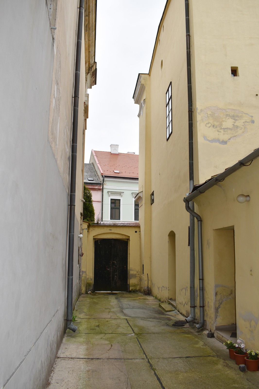 Mielőtt azonban az alkalmazottak háza felépült volna, történt még egy közjáték. A 18. század közepén a veszprémi püspök, Padányi Bíró Márton és a piarista rend között hosszas pereskedés alakult ki amiatt, hogy a zsákutca északi oldalán sorakozó házak sávja kihez is tartozik. Végül „bejött a papírforma.” Győzött a püspök, aminek eredményeként a piaristák templomukat, rendházukat, majd iskolájukat az egykori zsákutca vonalától délre építhették fel. Ezzel megteremtődött az elvi lehetősége annak is, hogy a püspök a telket az északról határos püspöki rezidencia telkéhez csatolja.