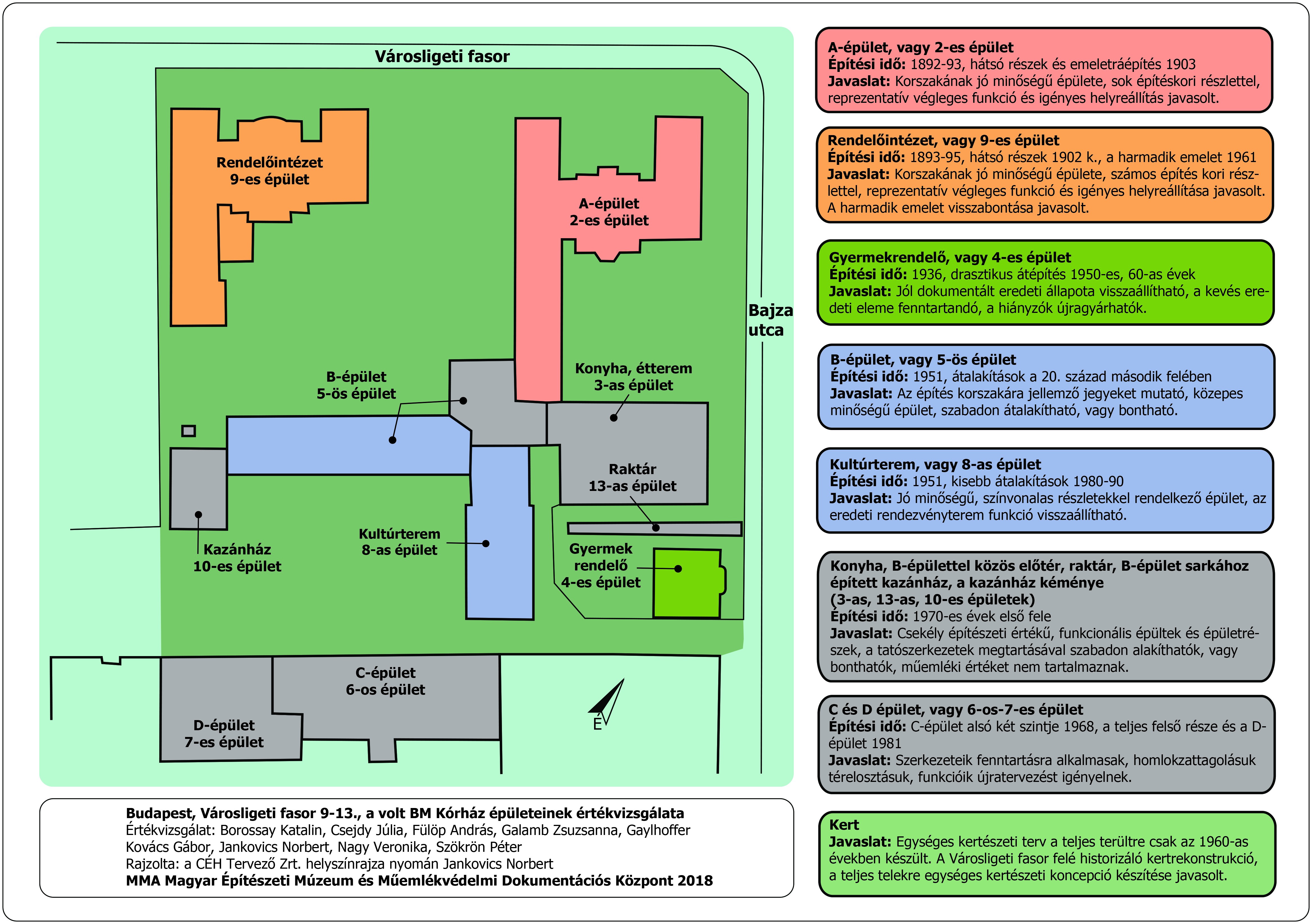 A jobb sorsra érdemes, de helyenként kifejezetten rossz állapotú volt kórházépületek ugyan nem védett műemlékek, de jó részük építészetileg igazi értéket képvisel (a telken mára megmaradt historizáló épületek egyikét Quittner Zsigmond, a másikat Schannen Ernő tervezte), így megérdemlik a nagyobb odafigyelést. 2018. év végén az épületegyüttesről munkatársaink (Borossay Katalin, Csejdy Júlia, Galamb Zsuzsanna, Nagy Veronika, Fülöp András, Jankovics Norbert, Szökrön Péter) eredetileg a műemlékek nyilvántartásba vételére kidolgozott, jogszabályban meghatározott adattartalommal bíró értékvizsgálati dokumentációt készítettek annak érdekében, hogy az építtető a tervezési koncepció kialakításához támpontot nyerhessen. 2019 tavaszán a Bajza utcára néző Fischer József által tervezett modernista épületről külön építéstörténeti dokumentáció (benne értékleltárral) készült, hiszen várhatóan ezzel a házzal kezdődik az épületegyüttes rehabilitációja. A villa, melyet Walter Rózsi operaénekesnő építtetett (így helyesebb rá a „Walter-villa,” semmint az olykor hallható „Fischer-villa” elnevezést alkalmazni), Ferkai András tollából már publikált épület. Az építéstörténeti dokumentáció ennek az ismeretanyagnak egy gyakorlatias szempontokhoz igazított megfogalmazása, kibővítése.
