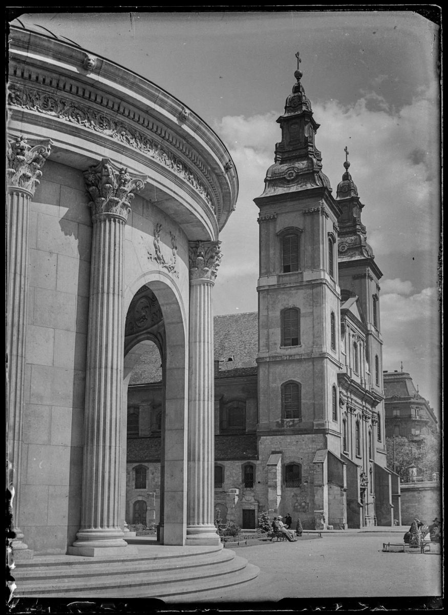 Ezen az 1930-as években készült fotón, bár fő témája a Belvárosi templom, mégis a tekintetünket először az előtérben elhelyezkedő Erzsébet királyné emlékmű védőépületének látványos íve ragadja meg. E szobor felállítását már 1898-ban, közvetlenül a királyné halála után elhatározták, erről törvény intézkedett, bizottság alakult és pályázatot írtak ki a szobor tervezésére. Sajnos az első, második, harmadik, sőt a negyedik pályázati forduló is sikertelenül zárult, csak az ötödik körben tudtak döntésre jutni, ekkor Zala György és Hikisch Rezső pályaműve győzött. A pályáztatás időszakában az elhelyezendő mű helyszíne is sokszor változott, eredetileg a Várhegy oldalába, majd az Ybl Miklós térre, később a Margitszigetre szánták. Végül 34 évvel a királyné halála után, 1932 szeptember 25-én, ünnepélyes külsőségek közepette, Horthy Miklós kormányzó részvételével avatták fel a mai Március 15., akkori Eskü téren. Az emlékmű nem aratott osztatlan sikert, sem a szakma, sem a közönség nem szerette, főleg a szobor fölé emelt csarnok váltott ki ellenérzéseket. Erről Genthon István a Magyar Szemle hasábjain így ír: „úgy hisszük tárgyilagosak maradtunk, ha azt állítjuk, hogy Hikisch Rezső historizáló ízlésű alkotása ízléses munka, de a maga helyén tökéletesen alkalmatlan és értelmetlen.” Fotónkon az épület monumentálisnak hat, azonban a valóságban inkább kisszerűnek ítélték a hatalmas Piarista-ház előterében, stílusa és méretrendje sem illett a benne foglalt szoborhoz. A világháborút az emlékmű épségben vészelte át, de az új szocialista rendszer nem pártolta a királyné kultuszát, így 1953-ban a szobrot eltávolították, helyére rövid időre Stróbl Alajos Halászlány-kútja került (ezt megrongálták, ezért 1959-ben eltávolították), a hatvanas évek elején pedig a védőépületet is lebontották az új Erzsébet-híd építése és a tér rendezése miatt.