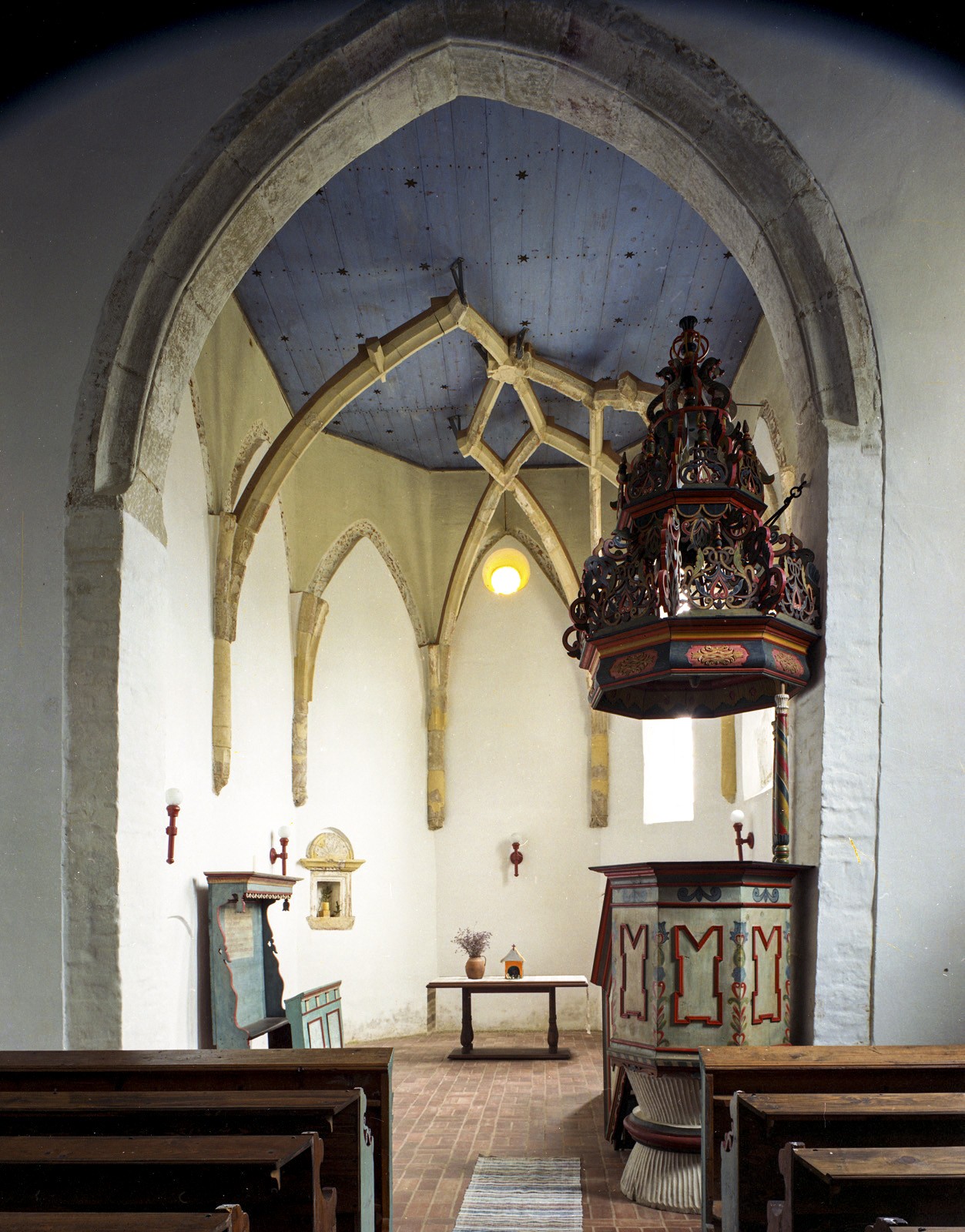Helyreállítása az 1986-ban elhunyt Erdei Ferenc egyik utolsó munkájaként valósult meg 1981–1986 között; Erdei munkatársai Szekér György és Sedlmayr János voltak. A helyreállítás során készült el a tető és a támpillérek zsindelyfedése, kiegészítették a gótikus nyíláskereteket, a festett berendezést restaurálták. Emellett a helyszíni kutatások során előkerült kőtöredékek alapján a teljes boltozatot hitelesen rekonstruálhatták volna, azonban a festett famennyezetet szintén értéknek tekintve, más döntés született. Mindössze utalásszerűen rekonstruálták a szentély első szakaszának gótikus hálóboltozati íveit (boltmezők nélküli bordaívek, csomópontok és egy zárókő felállításával) úgy, hogy közben a famennyezetet is megtartották. A részleges rekonstrukcióhoz a déli előcsarnokból emelték ki az oda másodlagosan befalazott bordaköveket, és a szentélyben lévő lenyomatok alapján tudták az egykori boltozatot elvben rekonstruálni. A részleges felállítás, ami a bordarendszer mintegy 40%-ának eredeti helyre történő visszahelyezését (anastylosisát) jelentette, egyértelműen utal a kétszakaszos, sorolt csillagháló-boltozatos térlefedésre, még ha a boltmezők üresek is maradtak. A szentélyboltozat helyreállításának kivitelezését három ütemben határozták meg, és mindháromhoz szöveggel kísért magyarázó ábrák készültek 1:20 és 1:100 léptékben, 1985 augusztusában. A műemléki tervtár leltározott állományában lévő terveket tovább fogja gazdagítani a jelenleg feldolgozás alatt álló hagyaték, amelyet Szekér György halála után örökösei bocsátottak rendelkezésünkre 2026 telén.