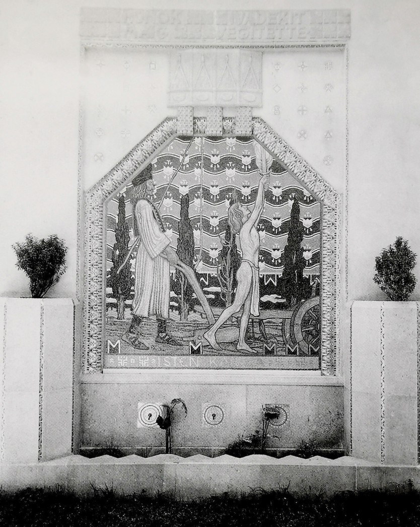 A díszítés a magyaros szecesszió stílusában készült. A gödöllői művésztelep alapítója, Nagy Sándor tervezte az oromzat Attila lakomáját ábrázoló ötrészes üvegablakát, Körösfői Kriesch Aladár pedig a főhomlokzat két mozaikját, bal oldalon az Isten kardja (A HUNOK IVADÉKIT MÁIG SEGÍTETTE felirattal), jobb oldalon az Aquileia ostromát megjelenítő alkotás kapott helyet.