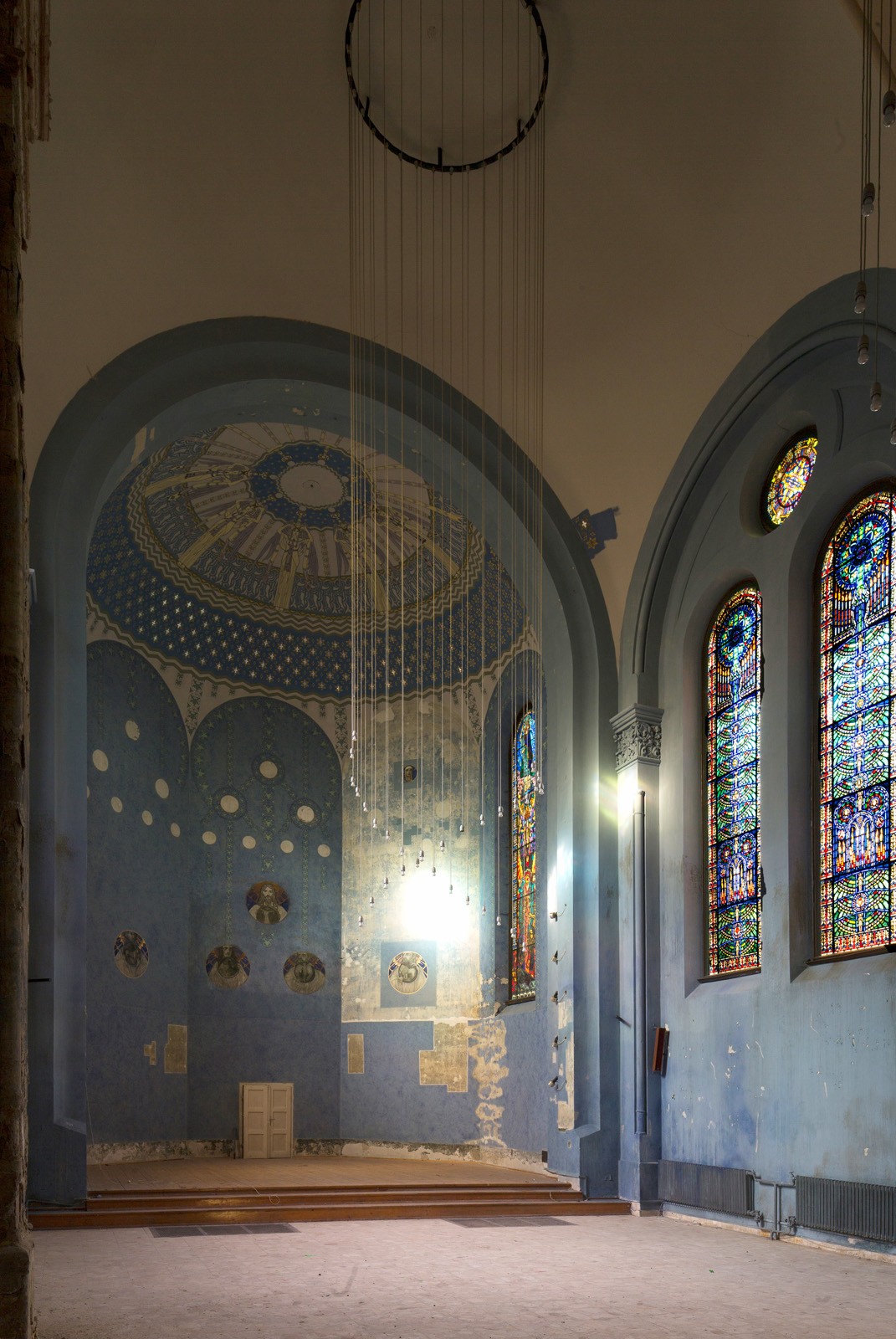 The construction of the one-time National Lunatic Asylum of Buda was decreed by Emperor Franz Josef I in 1857, and it was designed by the architectural councillor Lajos Zettl. The four-storey asylum erected on an estate called ’Leopoldfeld’, was built for 500 patients in Late Romantic style between 1860 and 1868. Additionally, the asylum grounds included a vast park and 50 acres of forest. The stained-glass windows of the institute’s chapel were designed and created in cooperation by the painter Sándor Nagy and the glass artist Miksa Róth. Owing to their iconography and colour compositions, the windows rank among the finest works of international glass painting. The chancel windows depict two glass paintings: the Fall, the Redemption, and the Last Judgement. The composition was made in line with a unique concept which followed the Bible as well as the Pre-Raphaelite method of depiction. The composition of colours is also scientifically grounded, since during the fashioning of the scenes, Miksa Róth and Sándor Nagy were continually advised by Gusztáv Oláh, the asylum’s director. Upon his request, the artists avoided using warm colours in a great amount, as they were assumed to affect the patients negatively. The colour scheme starts with dark orange/red, goes through colder and colder colours, and ends with different shades of blue. The topmost scenes as well as Christ’s figure convey tranquillity.