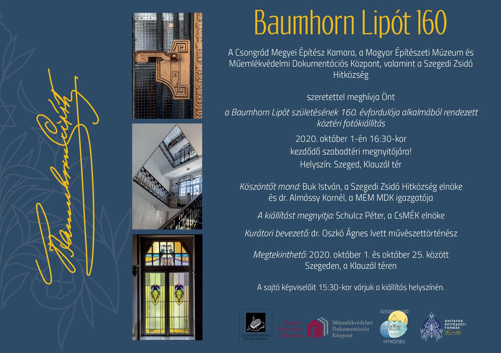 A Baumhorn Lipót 160 című köztéri fotókiállítás egy nagyobb rendezvénysorozat első állomása. A több hazai és határon túli helyszínre tervezett, Áhítatos építészeti formák – Baumhorn Lipót tervei a szegedi zsinagógához című vándorkiállítás 2021–2022-ben fog megvalósulni. Az esemény a MÉM MDK és a Szegedi Zsidó Hitközség közös projektje, mellyel a 120 éve tervezett, felújítatlan belső terű szegedi zsinagógára szeretnénk felhívni a figyelmet. A mostani fotóanyagot kiegészítve eredeti tervrajzok és rituális textilek bemutatásával idézzük majd fel Magyarország második legnagyobb zsinagógájának keletkezéstörténetét és nagyszabású összművészeti egységét.