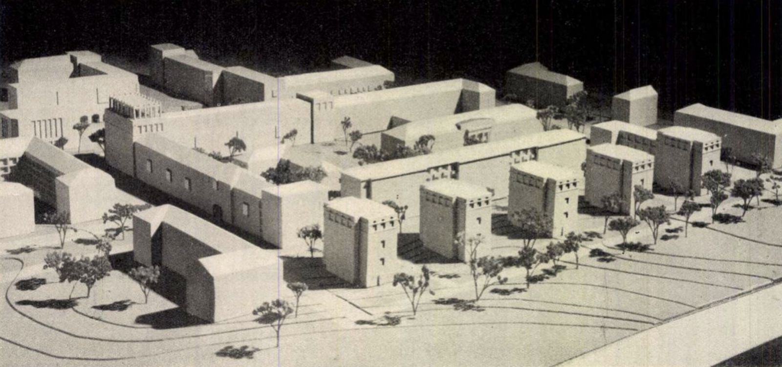 2-3/13 Tatabányai lakótelep. Vecsei Éva javaslatára a bányászlakások külön fürdőszobát kaptak az eredeti, közös fürdőhelyiséget irányzó terv helyett.1955, Modellfotó a vasút felől. Tervező: Vecsei Éva. [Forrás: Szőke 1955, 334. o.]