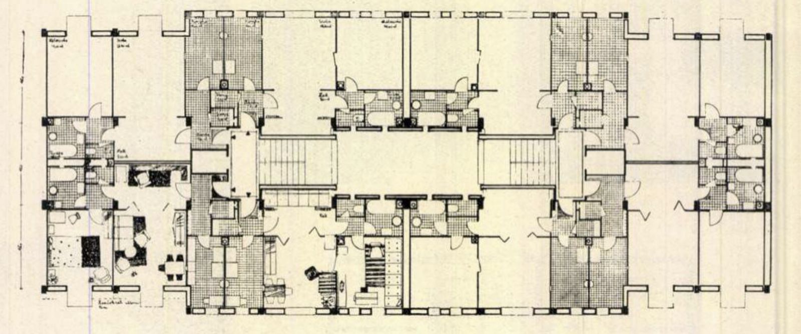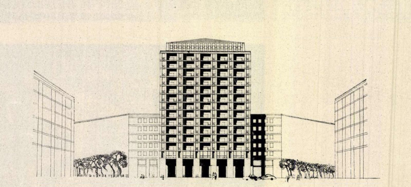 4/13 A 14 emeletes toronyépület homlokzati terve, mely a dán építészeti hagyományok hatását mutatja. A toronyépület nem valósult meg; csak az iskola épült fel. Tervező: Vecsei Éva. [Forrás: Cserba 1956, 142. o.]