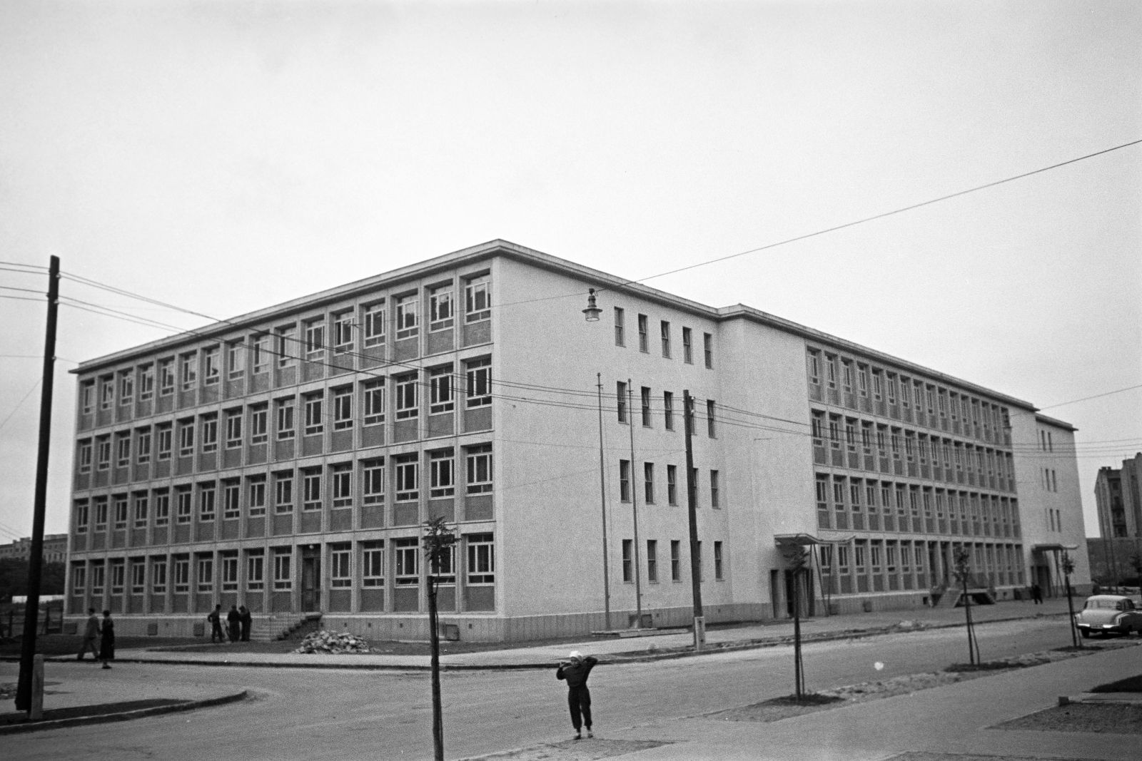 5/13 Az általános iskola épülete (későbbi nevén Lágymányosi Bárdos Lajos Két Tanítási Nyelvű Általános Iskola), amelyet Vecsei Éva tervezett 1956-ban Budapesten, a XI. kerületben. Ez az egyetlen olyan épület Magyarországon, amely máig fennmaradt a nevéhez köthetően. Baranyai utca 16–18. A fénykép 1960-ban készült. Forrás: Fortepan / Hámori Gyula / 276366.