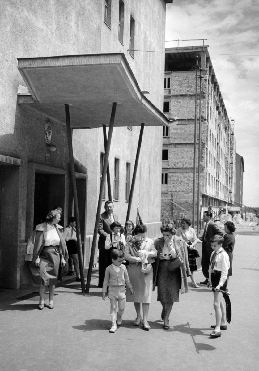 6/13 Az általános iskola bejárati portálja a XI. kerületi Baranyai utca 16–18. szám alatt (későbbi nevén Lágymányosi Bárdos Lajos Két Tanítási Nyelvű Általános Iskola), Budapest. A fénykép 1961-ben készült. Forrás: Fortepan / Sólyi Ilona / 220614.
