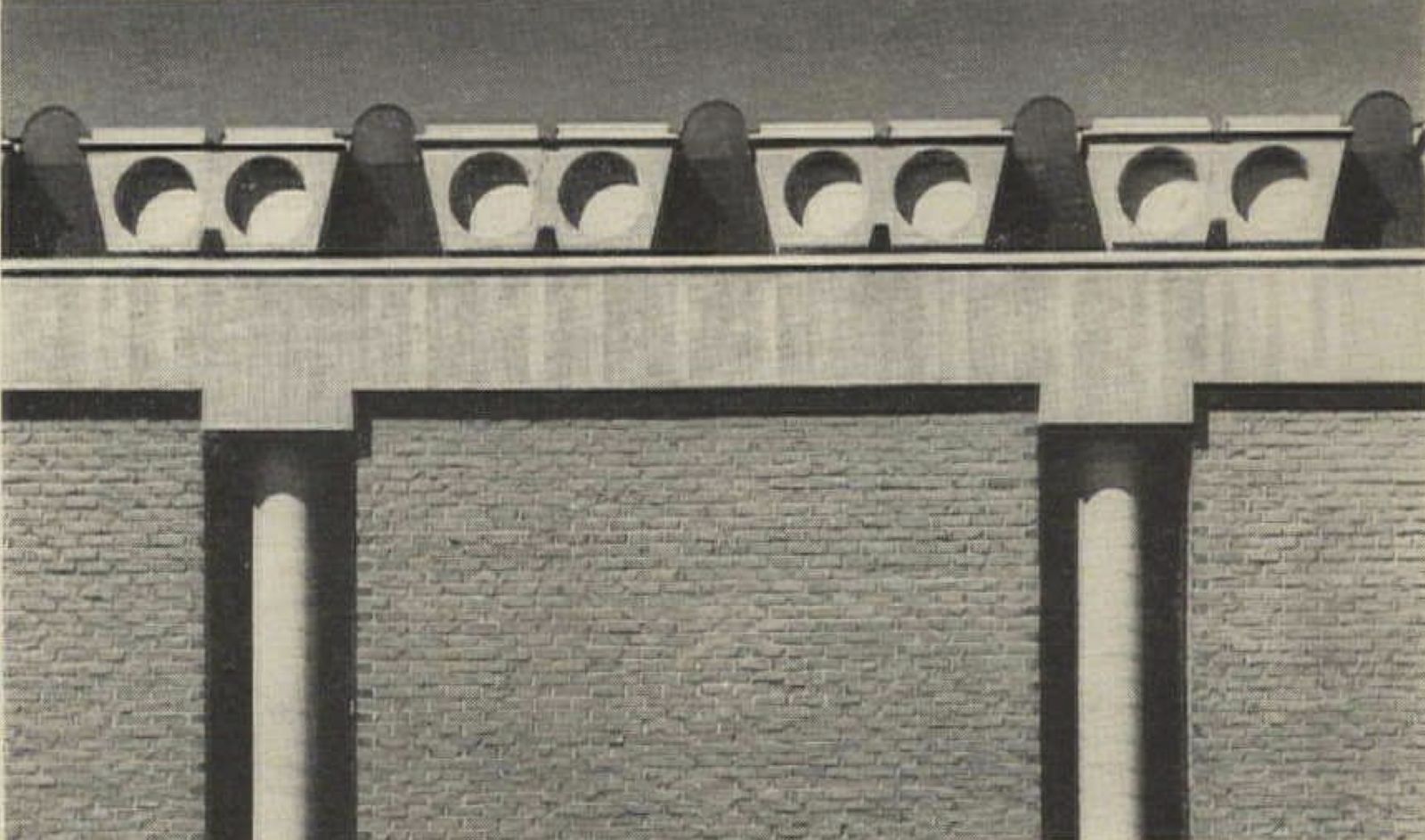 7/13 Concordia Kiállítási Csarnok, Place Bonaventure, Montréal 17 emeletes, 2,4 hektáros épületkomplexum, amely magában foglalja a 17.000 férőhelyes Concordia Kiállítási Csarnokot, valamint egy ötszintes, 18 580 négyzetméteres bevásárlóközpontot. Tervezők: Raymond T. Affleck és Vecsei Éva. [Ismeretlen szerző. Forrás: Schmertz, 1965, 125. o.]