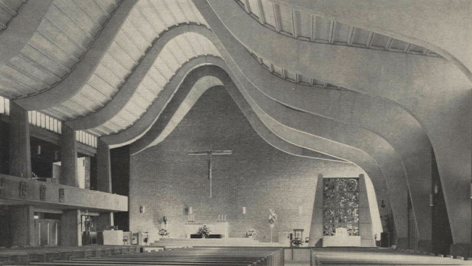 9/13 St. Gerard Majella templom, ívelt tetőszerkezet. A templom magas, ívelt tetőszerkezete a kóruskarzat befogadását szolgálja, és a főoltár tengelyén emelkedik a legmagasabbra. [Han-Sa. Forrás: Schmertz, 1965, 137. o.]