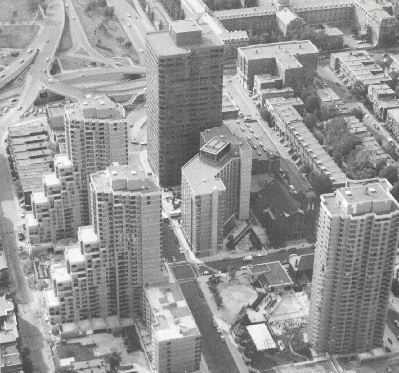 13/13 La Cité, Montréal (1973–1977). Multifunkcionális épületkomplexum, amely 120 millió dollárból valósult meg az 1976-os olimpia számára. A négy városblokkra kiterjedő, 2,8 hektáros projekt lakó- és közösségi funkciókat egyesít. (1973–1977). [V. Juster. Forrás: Schmertz 1978, 111. o.]