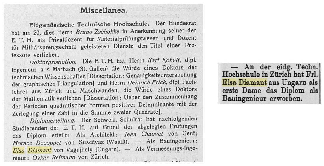 [8] Ld. Frauenförderung an der ETH, url: https://ethz.ch/staffnet/de/anstellung-und-arbeit/arbeitsumfeld/diversity/themen/frauenfoerderung.html (letöltés dátuma: 2026. február 10.) Érdekes módon az ETH saját adatbázisa 1919-et tüntet fel Diamant Elza diplomázásának éveként, holott a papírjaiból nyilvánvalóan kiolvasható az 1918-as dátum. Helyesen szerepel viszont egy 2017-es müncheni kiállítás kapcsán megjelent tanulmányban a mérnöki hivatás fejlődéséről: Bill Addis: Tief- und Hochbauingenieure - die Entstehung der Berufe. In: Visionäre und Alltagshelden. Ingenieure Bauen Zukunft. Detail, München, 2017. 14-19. o. Url: https://issuu.com/detail-magazine/docs/bk_978-3-95553-375-5_visionaere_und (letöltés dátuma: 2026. február 10.)