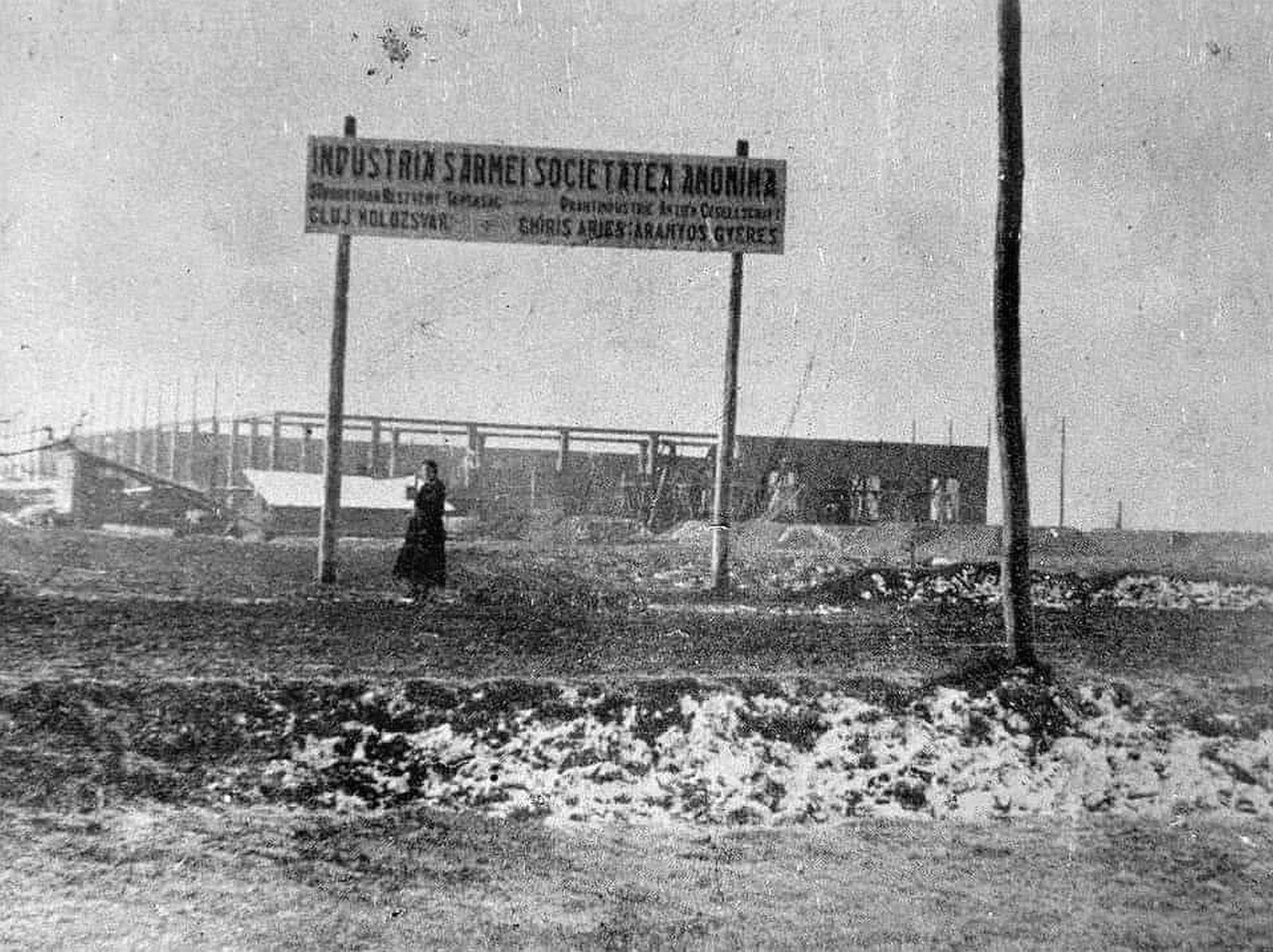 Az aranyosgyéresi gyár építkezése az 1920-as évek elején, a tábla alatt minden bizonnyal Diamant Elza áll. Fotó: Tibori-Szabó Zoltán jóvoltából