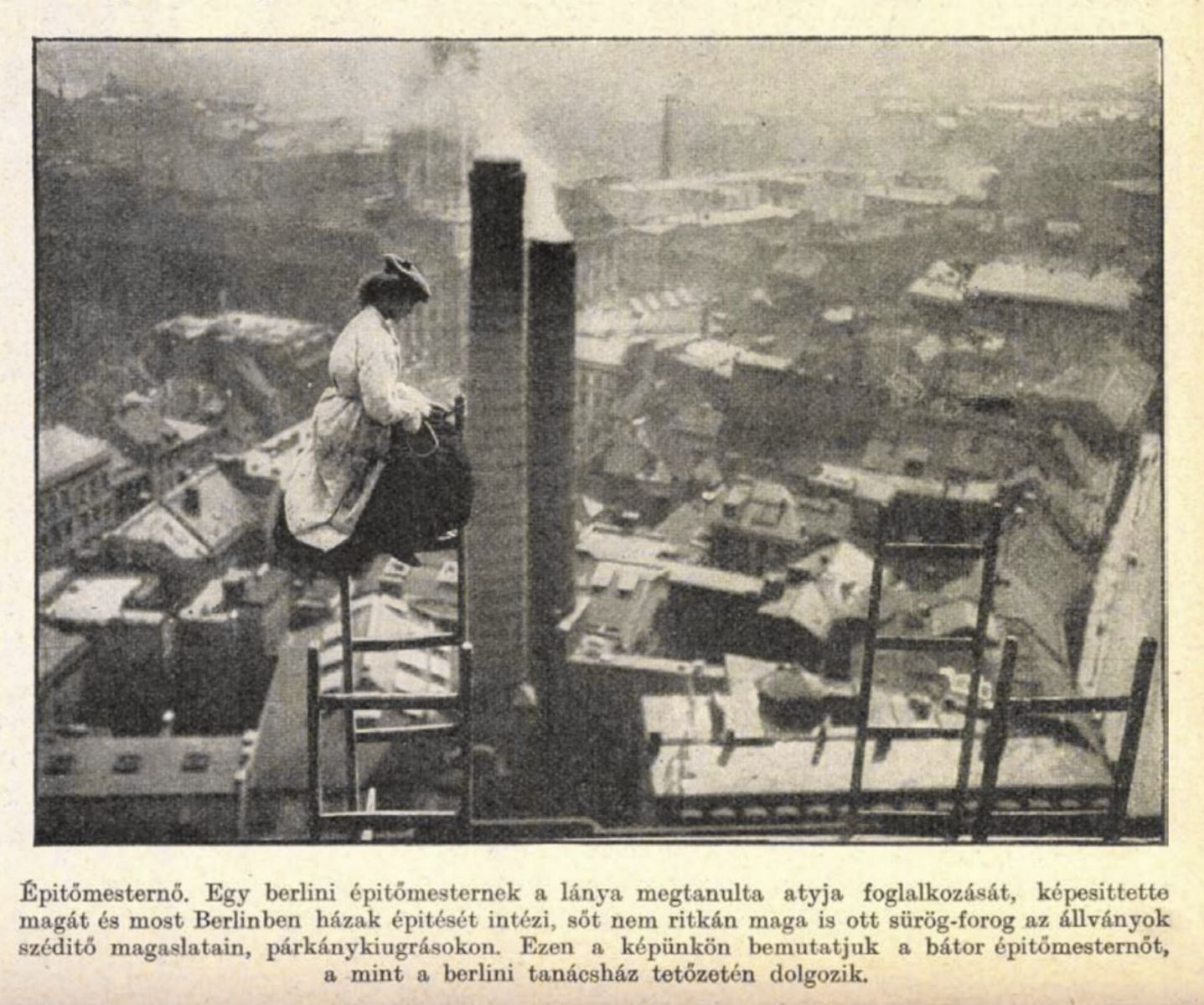 Berlini építőmesternő fényképe a Tolnai Világlapja 1910. augusztus 28-i számából. A korabeli elvárások szerint öltözött nőknek nem volt egyszerű kihívás az építőipari szakmunka. Forrás: ADT Arcanum