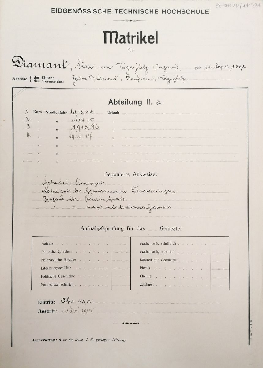 Diamant Elza beiratkozási lapja a zürichi ETH archívumából. Fotó: Kovács Dániel