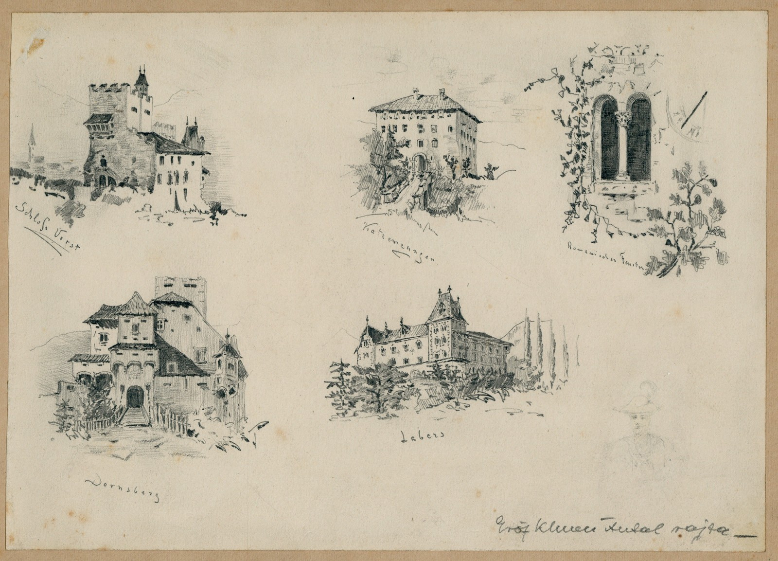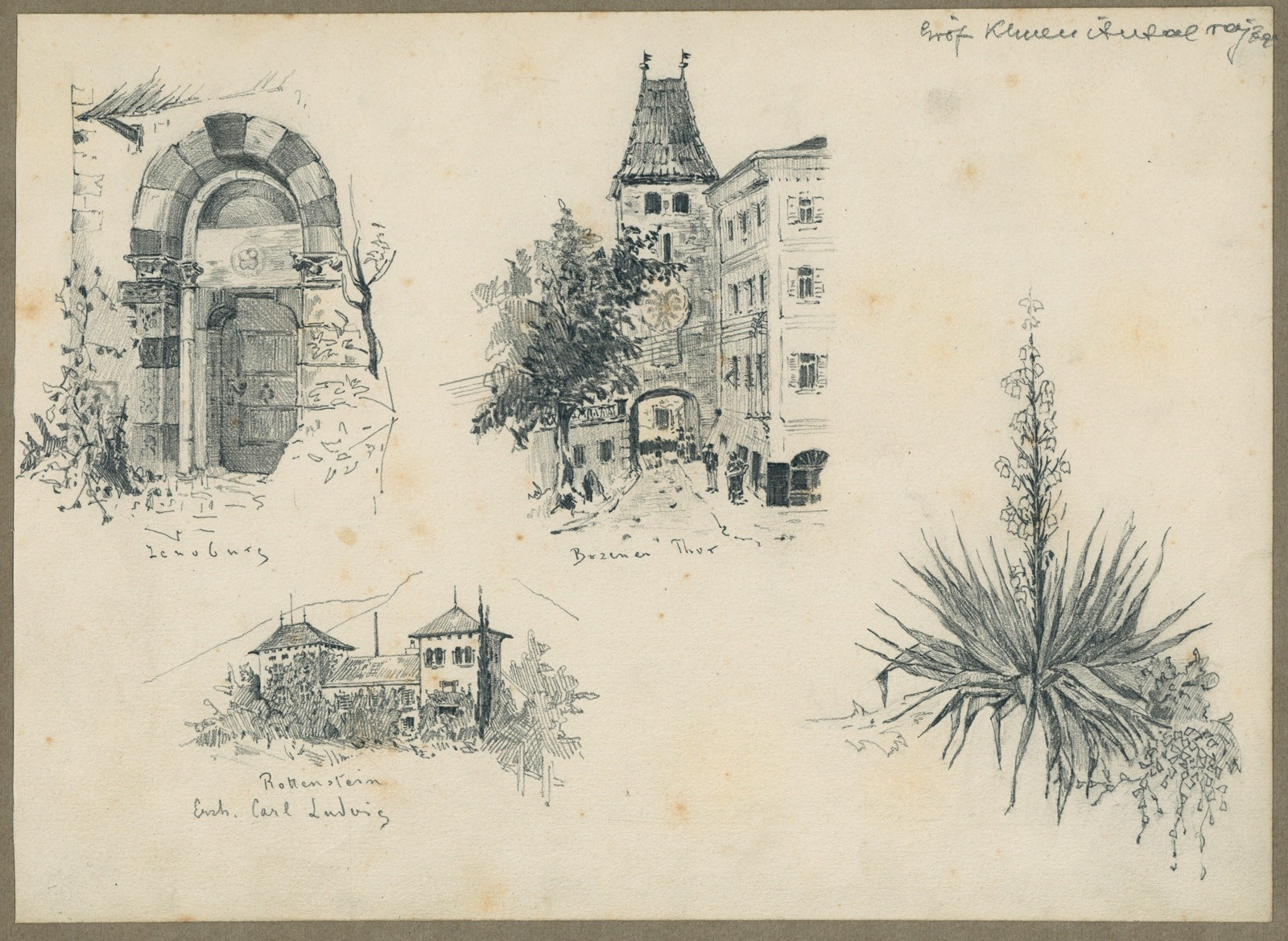 Khuen Antal rajzai Möller István hagyatékából kerültek elő. Datálás nem olvasható rajtuk, de Khuen egészségi állapotát tekintve valószínűleg még Magyarországra való visszatérése előtt (1880) készülhettek. A rajzokon a dél-tiroli Merano (1. kép: Zenoburg kastélya [Zenoburg]; Bozner kapu [Bozener Thor]; Habsburg-Lotaringiai Károly Lajos főherceg Rottenstein-kastély [Rothenstein, Erzh. Carl Ludvig]) és környékének nevesebb helyszíneit láthatjuk (2. kép: Forst-kastély [Schloss Vorst]; Katzenzungen-kastély [Katzenzungen]; román stílusú ablak [Romanischer Fenster]; Dornsberg-kastély [Dornsberg]; Labers-kastély [Labers]). Feltételezhetően többször is meglátogatta ezt a térséget, mivel a Khuen család eredetileg dél-tiroli, Khuen Antal apja házasság révén jutott a hédervári kastélyhoz és Héderváry grófi címhez.